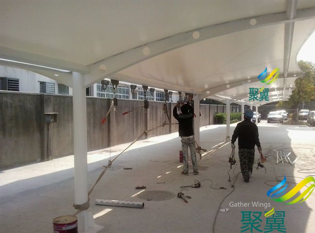 停車蓬JY20B抗風力好,耐久性強,對熱能反射率73%壽命長膜結構車篷劃分的種類:第一種,反向張力膜結構;反向彎曲形狀,或者是具有張力并且