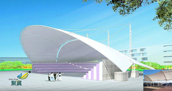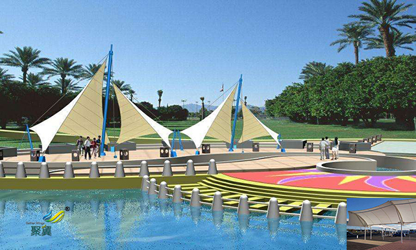 4、景觀膜結構膜材料表面加涂的防護涂層,具有耐溫的特點,而且本身不發粘,這樣落到膜材料表面的灰塵可以靠雨水的自然沖洗而達到自潔的效果。