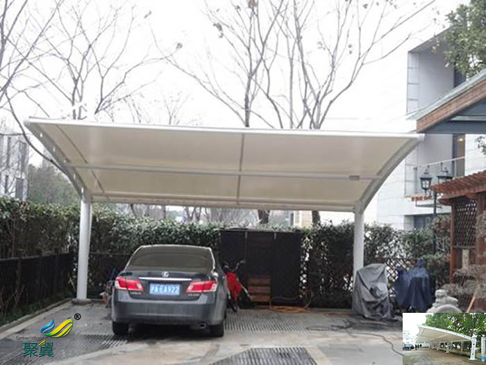 膜結構車棚是由多種高強薄膜材料及加強構件(鋼架、鋼柱或鋼索)通過一定方式使其內部產生一定的預張應力以形成某種空間形狀,作為覆蓋結構,并能承受一定的外荷載作用的一種空間結構形式。膜結構車棚的篷布采用PVC/PVDF/PTFE/ETFE,而膜材的特點是強度高、耐久性好、防火難燃、自潔性好,不受紫外線影響,使用壽命長,一般15-30年。具有高透光率,透光率為13%,對熱能反射率73%,熱吸收量很少。正是因為這種劃時代的膜材料的發明,使膜結構車棚成為現代化的永久建筑。