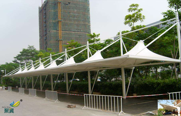 3、膜結構汽車棚輕量結構-抗災、救災威力大,膜材料與其他建筑材料相比要輕的多,屋頂采用了膜材料的建筑物,具有極強的抗震性及良好的安全性。而且,在發生災害時,采用了膜結構的多功能設施及體育館,其無柱而明亮的大空間,可以用來作為臨時的避難場所、急救中心、抗災指揮部等。因此,在危急之時,膜結構建筑可以保護人們的安全。
