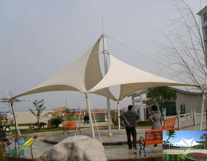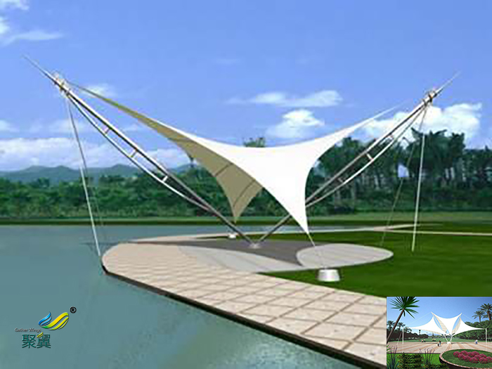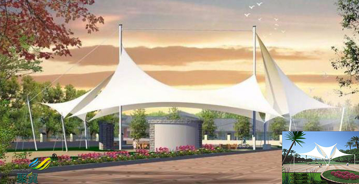 3、景觀膜結構極具表現力的建筑形態:具有特定功能的建筑都可通過立意得以表達,張拉膜結構的獨特外形體現了建筑自身的自然美感。這些建筑形態本身和與其相協調的傳統建筑一起構成了令人興致盎然的地面標志性建筑。