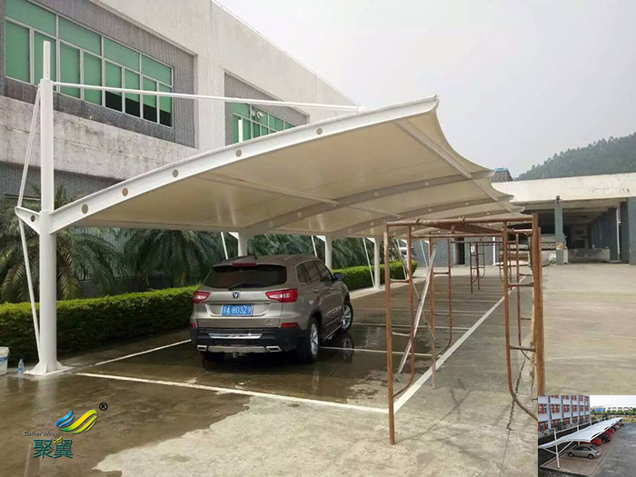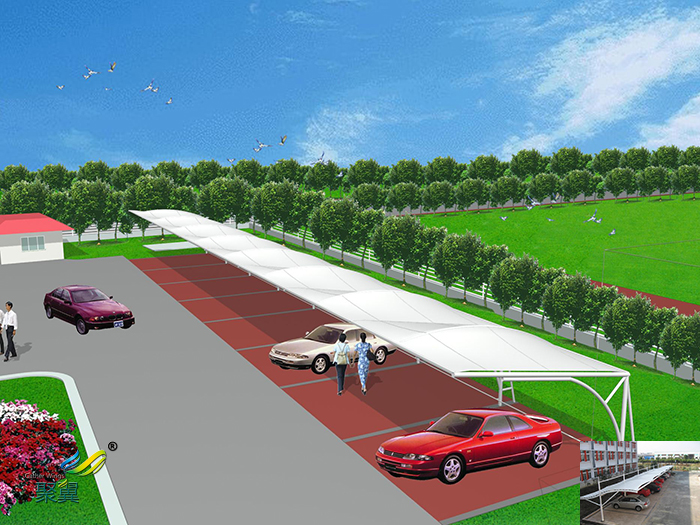 膜結構車棚的篷布材質是膜結構,而膜材的大特點是強度高、耐久性好、防火難燃、自潔性好,不受紫外線影響,使用壽命長,一般15-30年。具有高透光率,透光率為13%,對熱能反射率73%,熱吸收量很少。正是因為這種劃時代的膜材料的發明,使膜結構車棚成為現代化的建筑。制作步驟點,加工準備及下料:依據施工圖放樣,放樣和號料時要預留焊接收縮量和加工余量,依據放樣作樣板。第二點,測量放線:依據土建標高基準線測預埋件標高中心線,檢查預埋件標高偏差、左右偏差。整理結果,確定預埋件分隔的調整處理方案。第三點,預埋件安裝處理:定位預埋件安裝位置,打鉆安裝。要求預埋件位置準確、埋設牢固。標高偏差不大于9mm,左右位移不大于20mm。第四點,懸掛臂安裝焊接:懸掛臂安裝采用焊接,需檢查焊接節點,調節懸掛臂設計坡度,準確無誤方能進行焊接??窟呉粭l懸掛臂準確無誤后,安裝另一邊一條懸掛臂,就位準確后點焊。