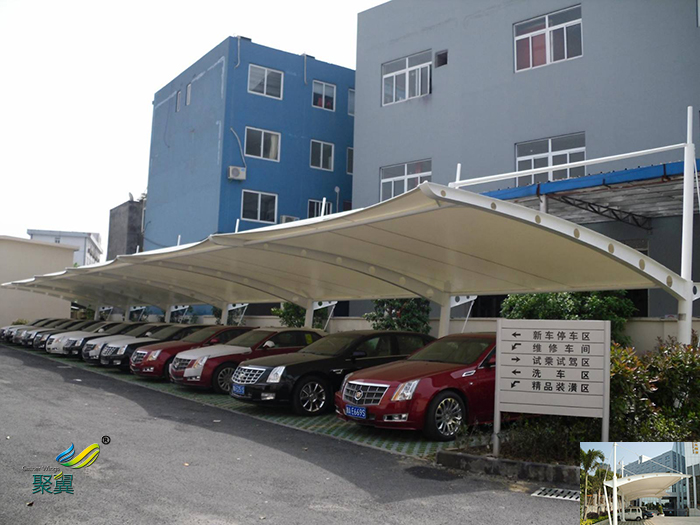 張拉式膜結構,以膜材、鋼索及支柱構成,利用鋼索與支柱在膜材中導入張力以達安定的形式。除了可實踐具有創意、創新且美觀的造型外也是能展現膜結構精神的構造形式。近年來,大型跨距空間也多采用以鋼索與壓縮材料構成鋼索網來支撐上部膜材的形式。膜結構車棚施工精度要求高,結構性能強,且具豐富的表現力。