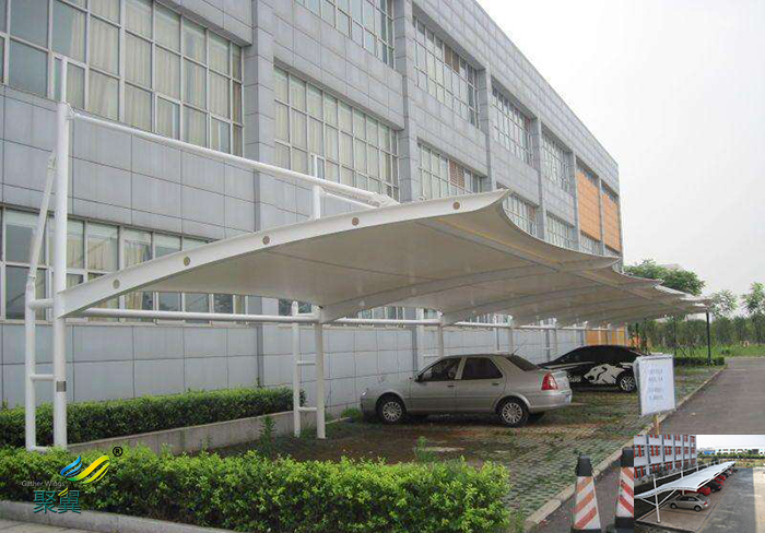膜結(jié)構(gòu)車棚是現(xiàn)代大跨度空間結(jié)構(gòu)停車場(chǎng)的主要建設(shè)形式之一,具有自身重量輕、受力良好、造型別致等特點(diǎn)。這種結(jié)構(gòu)除了能滿足防風(fēng)雨、防日曬等基本功能外,還有較好的標(biāo)識(shí)招攬效果。