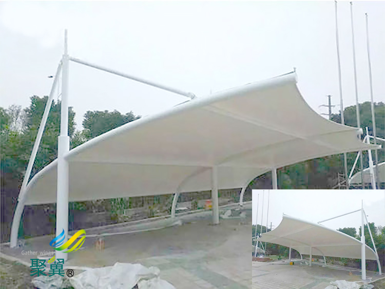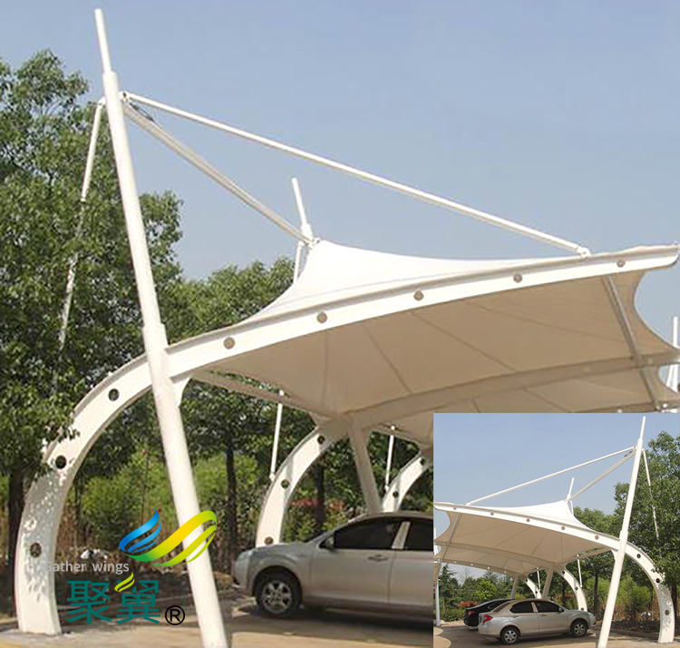聚翼車棚材料選用了進口結構建筑材料。膜結構車棚的篷布材質是膜結構,而膜材最大特點是強度高、耐久性好、防火難燃、自潔性好,不受紫外線影響,使用壽命長,一般15-30年。