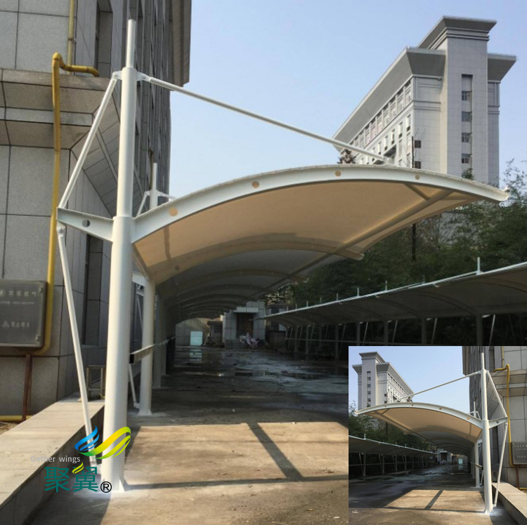 汽車停車棚是依靠膜自身的張拉應力與支撐桿和拉索共同構成機構體系。經典7字型車棚骨架采用鋼結構(國標Q235)鋼管一般厚度在: 5mm 6mm 7mm  8mm 9mm材料制作而成,別墅車棚停車棚鋼結構要經過反復加工(切割、打磨、除銹、噴底漆、中間漆、面漆、成品后在做后期處理,從而達到持久不生銹效果),所以景觀篷、膜結構車棚、膜傘、別墅車棚停車棚等產品壽命是別的產品無法達到鋼結構膜結構產品的.景觀膜結構款式獨特、新穎、壽命長、美觀、亮麗、時尚。