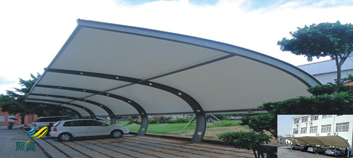 膜結構別墅私家停車棚的篷布材質是膜材,而膜材的特點是強度高、耐久性好、防火難燃、自潔性好,不受紫外線影響,使用壽命長,一般15-30年。