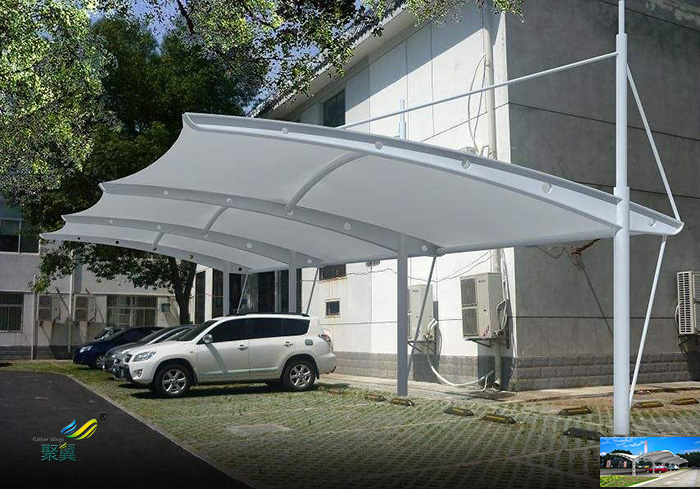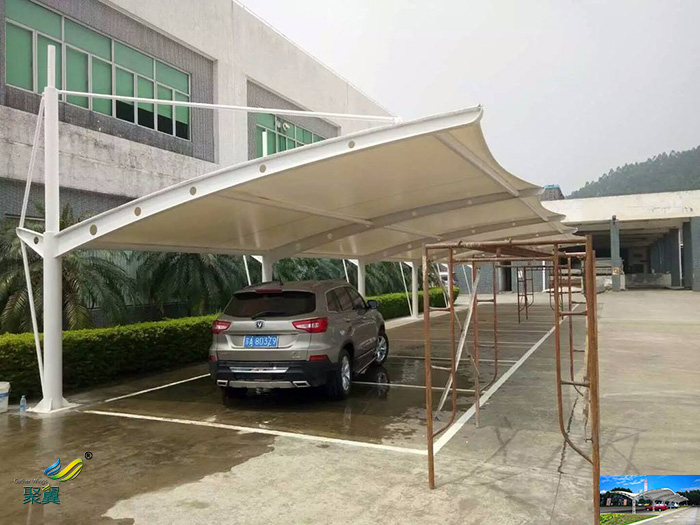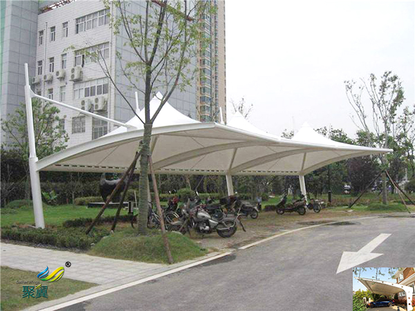 1. 廠區車棚耐用:由于高強度的膜材出現,再加上張拉技術的應用,使膜結構車棚抵御風雨的能力是一般雨蓬之類不可比擬的。有的車棚采用膜材,可使用三、四十年。特別是遇到劇烈的暴風雨天氣,膜結構建筑巍然不動,毫發不損。