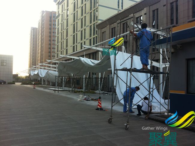 詳細>>冒頂汽車停車蓬所采用的面料是PVDF車篷專用膜布材料,骨架采用鋼結構(國標Q235)鋼管厚度在:5m...