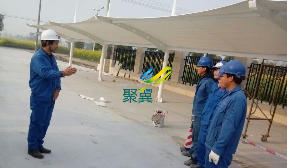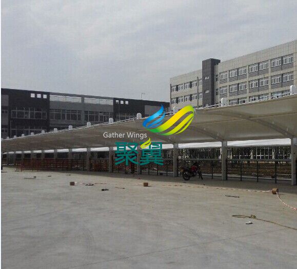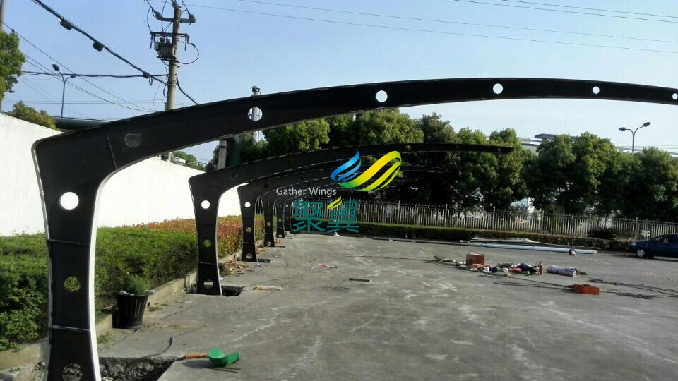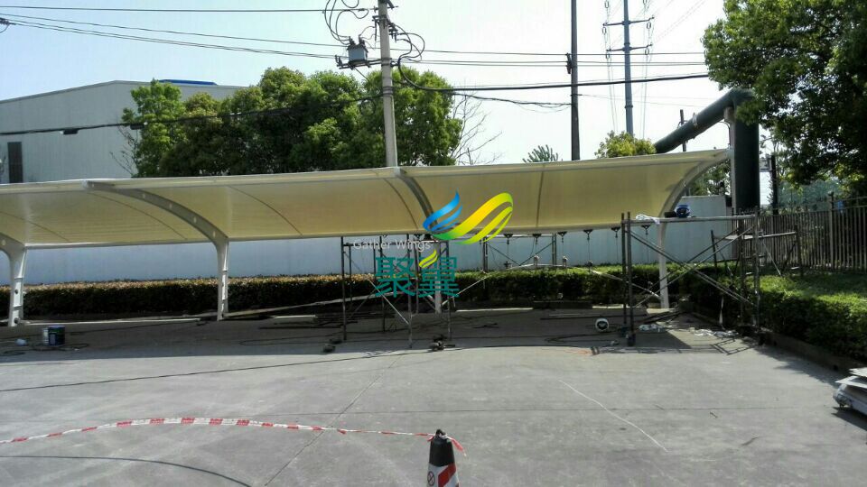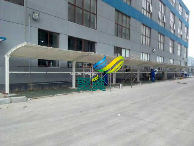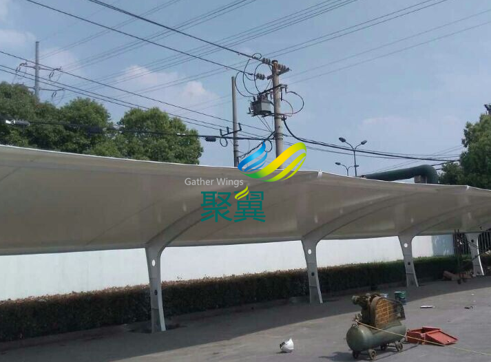 江陰異形鋼膜結構車棚,長6.1米,間距5.45米,立柱高3米,前高3米,后高2米,特殊情況,特殊定制! 電話:021-61726028 / 60489599 / 60485955 傳真:021-33275120