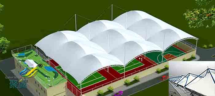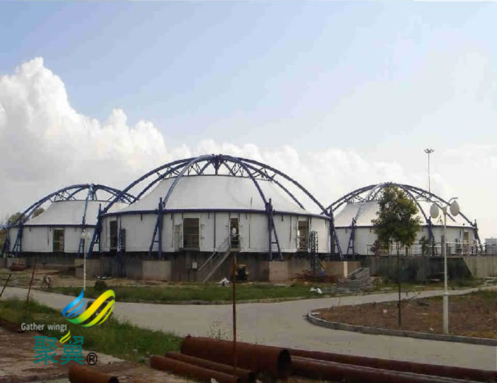 污水池蓋也叫污水池罩、臭氣收集罩。是一種新型的大跨度空間結構,越來越受到用戶的喜愛和使用,污水池加蓋是由具有優良性能的織物(膜材)通過支撐構件(如剛性梁、柱、柔性索),或給膜內空氣加壓以一定的方式組合并施加適當的初始預張力而形成具有一定剛度的空間結構形狀,從而承受一定外荷載的一種空間結構形式。而膜材料是大跨度空間結構最重要的組成部分,被稱為“第五代建材”。具有耐腐阻燃,堅固防滑、質量輕、易安裝、免維護、絕緣等優異特性。