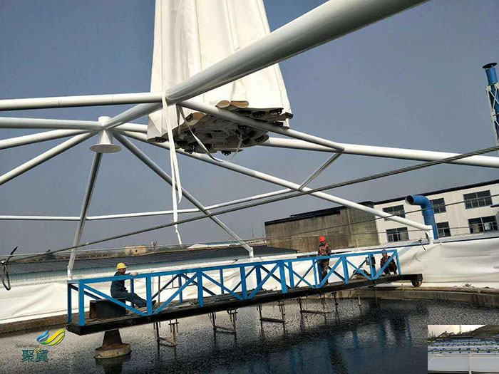 1.反吊膜:污水池廢氣除臭所采用的反吊膜是一種專門處理廢氣的環保膜材-氟碳纖維膜,這種膜材具有抗拉性能強,耐磨,耐紫外線等優點,而且反吊膜表面經過uv光固化處理后,能長久保持膜面清潔如初,節省工作人員的維護工作。