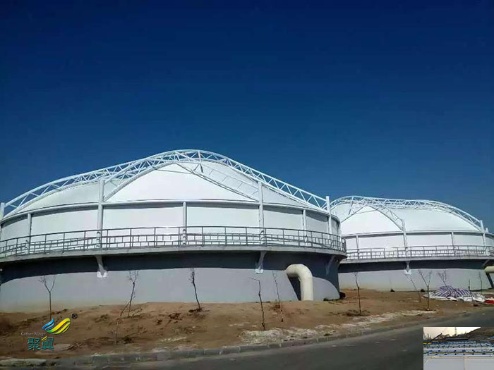 3.污水池加蓋具有高強度低紗聚酯絲;這種特性很好的保證了膜材的抗拉性能,不容易被撕裂,而且耐磨損,氣密性好等特點。