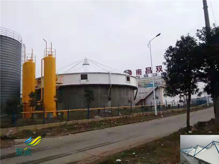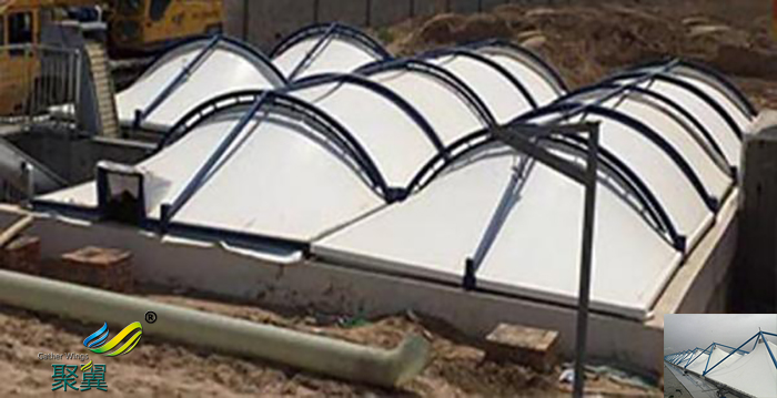 3.污水池加蓋具有高強度低紗聚酯絲;這種特性很好的保證了膜材的抗拉性能,不容易被撕裂,而且耐磨損,氣密性好等特點。