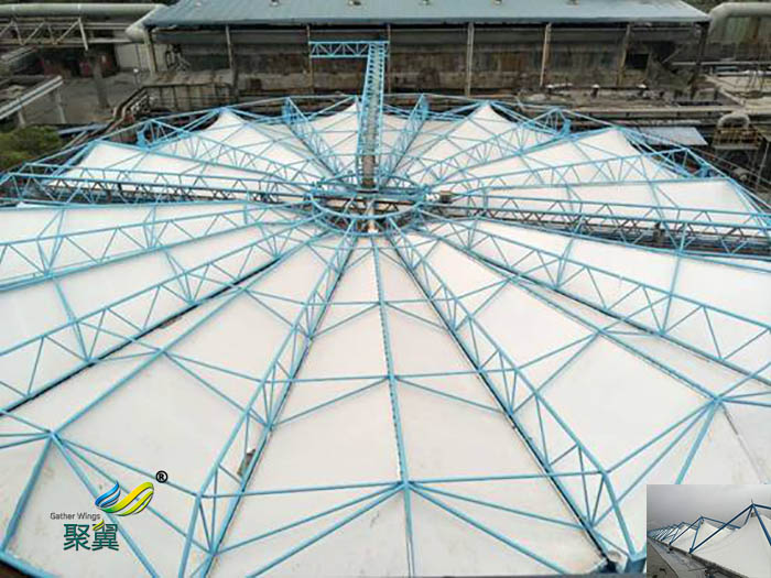 2.污水池加蓋優質的PVC涂層;改變了傳統涂層材料的表面特性,具有優良的抗污染能力,能長久保持清潔干凈,這樣,不僅增強了膜材的抗氧化性,而且延長了膜材的使用壽命;