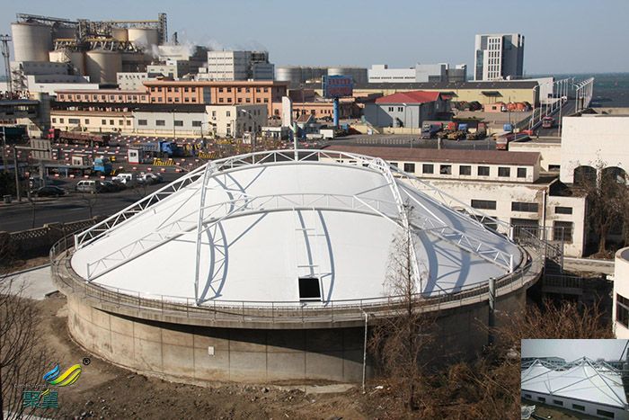 2、污水池加蓋防腐效果好;由于膜材料結構建筑的特殊性,可將鋼架設在外面,只有膜材料結構接觸污水池,基本解決腐蝕問題,而且將來也不用考慮保養問題。