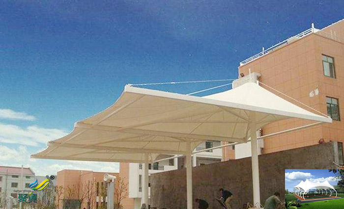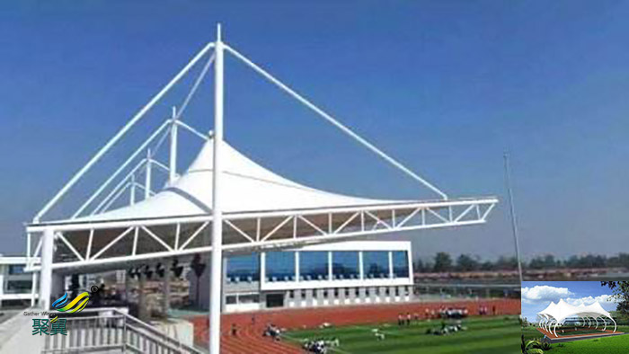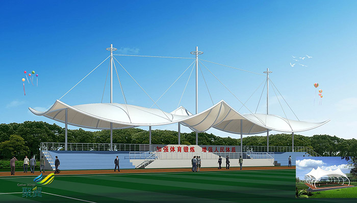 為了解決鋼構配合鋁塑板的弊病,膜結構慢慢進入了看臺市場,相比傳統的建筑形式膜結構體育看臺的優點很多:首先它不僅滿足了造型的多樣性、夸張性,而且也完美的解決了對于大跨度結構用鋼量大的問題,往往對于大跨度的結構來說,起跨度尺寸就代表著需要大量的鋼結構來補足,然而對于膜結構來說,其特有的延展性和超高的的抗拉強度完美的解決了大跨度帶來的困擾,大大的節約了施工成本。其各種顏色的配比也使得其與周邊環境多了更多的搭配方式,膜結構常用膜材特有的自潔效果防水效果,降低了后期對于主體結構的維護費用。膜材質保年限最低10年,高的能達到25-30年的材料質保,這也使得設計成永久性建筑的設計初衷得到了完美的結合。而且其相對于鋼筋混凝土和純鋼結構來說還有一明顯優點---施工周期短(自重輕、結構簡單)。另外膜結構還有一優于其它結構的顯著特點——半透明性,白天能將陽光漫反射到結構以下,能完美的起到遮陽效果,還不影響其下方正常使用;在夜晚可以逆光照射,使得膜材表面發光,造就一個不一樣的視覺盛宴。