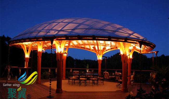 膜結(jié)構(gòu)所用的膜材從生產(chǎn)到加工,都是無毒無害的,使用壽命長,而且不會對環(huán)境造成任何影響,而且其自動輕,所以其基礎(chǔ)施工以及支撐系統(tǒng)的材料用量都將大大減少,而且膜材具有良好的通光率,白天完全依靠自然光滿足室內(nèi)的照明,這就大大減少了照明設(shè)施的運(yùn)轉(zhuǎn)時(shí)間,降低用電量,而且這種明亮是依靠光線的漫反射,會讓人感覺很柔和,景觀膜結(jié)構(gòu)中的主要材料膜材、剛才都是可以回收循環(huán)利用的,這就進(jìn)一步的節(jié)省了景觀膜結(jié)構(gòu)材料。