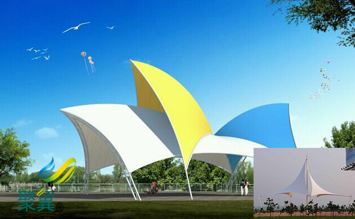 膜結構景觀工程能提供豐富多彩的用途,并與園林景觀溶為一體。創造出讓人們盡情享受的快樂空間。充分展示了結構構件清晰受力的藝術之美,它巧妙的整合周圍的環境,給人們一種典雅、浪漫溫馨之感。另外由于膜材料本身有的顯色性,在夜間彩燈的映射下能形成絢麗繽紛的景觀。不僅為人們提供遮陽避雨的空間。