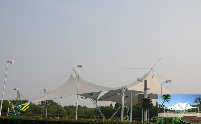 三點,景觀膜結構施工周期短。膜片的裁剪制造、鋼索和鋼結構的制造均在工廠內完結,景觀膜結構在施工現場僅僅鋼索、鋼結構及膜片的銜接安裝及張拉的進程,因此在現場的施工安裝比較方便且安全。