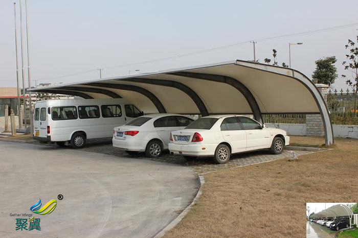 2.膜結構車棚藝術性:除了一般雨蓬不可比擬的實用、耐用、遮風擋雨的功能外,膜結構雨蓬更是一座雕塑,一件藝術品,給人美的視覺享受。膜結構車棚其柔美,其曲線,其剛柔并濟,其豐富造型,其潔白無瑕,讓人眼前一亮,回味悠長。