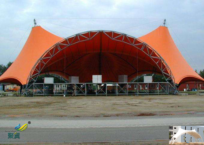 舞臺建筑膜結構被人們廣泛應用于各類新型建筑。那么,膜結構常用的材質有哪些?玻纖PVC:為提高PVC本身的耐老化性能,涂層加入一些光、熱穩定劑,淺色透明產品加一定量的紫外吸收劑,深色產品加炭黑做穩定劑,也可以在PVC上層壓一層極薄的金屬薄膜或噴射鋁霧,用云母或石英來防止表面發粘和沾污。玻纖有機硅樹脂:具有非常好的耐高低溫、拒水、抗氧化等特點,舞臺建筑膜結構有較高的抗拉強度和彈性模量,有良好的透光性。這種膜材應用的不多,生產廠家也較少。PTFE:PTFE膜材無疑是的,以超細玻璃纖維織物為基材涂以聚四氟乙烯樹脂(PTEF)而成。優點:阻燃、抗老化、抗紫外線、防污自潔性能好、較好的焊接性能;ETFE。由ETFE(乙烯-四氟乙烯共聚物)生料直接制成。優點:抗沖擊性、抗電、熱穩定、耐化學腐蝕、機械強度高、加工性能好、應用范圍廣、透光性能好、質量輕、延展性高等特點。