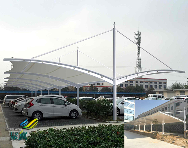 膜結構車棚直接焊接,無須打磨或加連接條,徹底清除第一代PVDF膜材所引起的各種工程質量隱患,如:因膜結構車棚焊縫處涂層需打磨而產生的焊接強度不穩定等等,大大減少膜結構車棚膜材加工的工作量,降低加工成本。