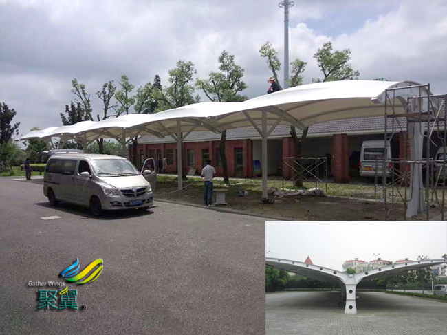 膜結構車棚耐用:由于高強度的膜材出現,再加上張拉技術的應用,使膜結構車棚抵御風雨的能力是一般雨蓬之類不可比擬的。有的車棚采用永久性膜材,可使用三、四十年。特別是遇到劇烈的暴風雨天氣,膜結構車棚建筑巍然不動,毫發不損。