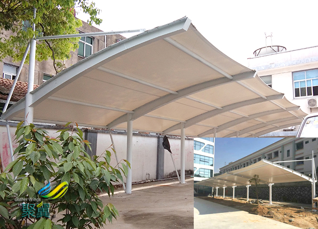 依據膜結構車棚膜資料的有用運用年限應及時進行交換。膜結構建筑物的悉數檢修保護項目應包含膜結構車棚膜面的形狀、變形、前期張力狀況、悉數或部分決裂和褶皺。