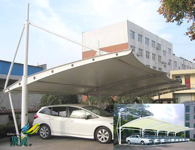 膜結構車棚剪裁設計:這一過程應具備必要的試驗數據,包括所選用膜結構車棚膜材的楊氏模量和剪裁補償值(應通過雙軸拉伸試驗確定)。