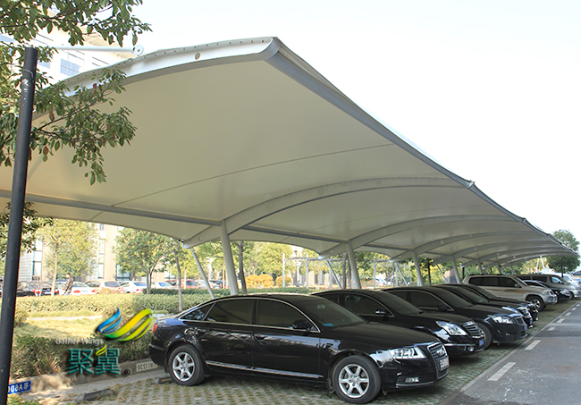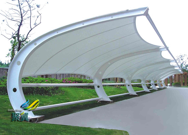 膜結構車棚耐候性:表面有防紫外線的共擠層,可防止太陽紫外線引起的樹脂疲勞變黃。膜結構車棚表面共擠層具有化學吸收紫外線并轉化為可見光。