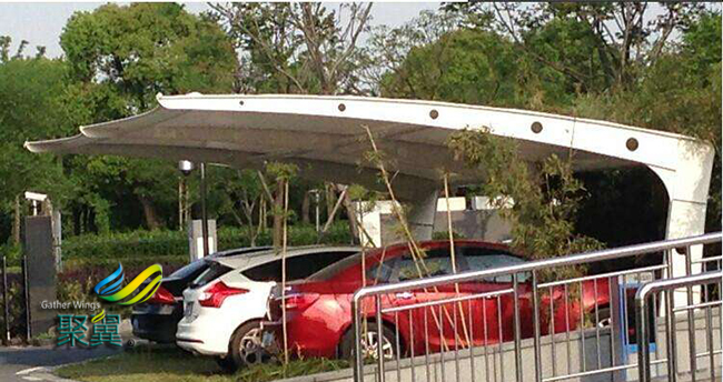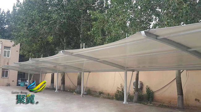 膜結構車棚PVC材料的主要特點是強度低、彈性大、易老化、徐變大、自潔性差,但膜結構車棚價格便宜,容易加工制作,色彩豐富,抗折疊性能好。為改善其性能,可在膜結構車棚表面涂一層聚四氟乙烯涂層,膜結構車棚提高其抗老化和自潔能力,其壽命可達到15年左右。