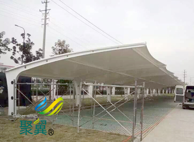 膜結構車棚PVC材料的主要特點是強度低、彈性大、易老化、徐變大、自潔性差,但膜結構車棚價格便宜,容易加工制作,色彩豐富,抗折疊性能好。
