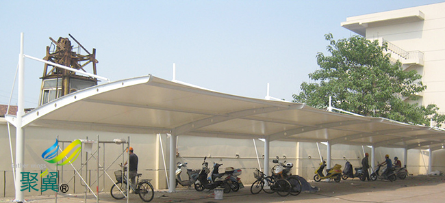 膜結構車棚自行車棚不只具有美麗的外觀、特性的外型并且其功用也對比突出,膜結構車棚是城市綠色化建造的一大輔佐。