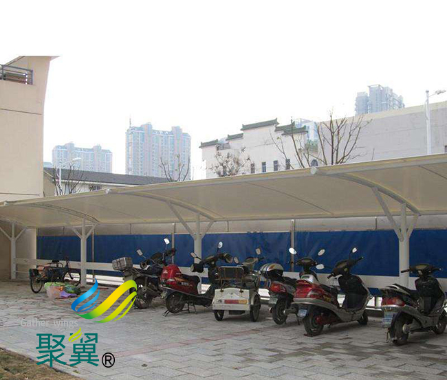 多款電動車、摩托車、自行車都適合安裝。讓普通電動車享受“轎車”的時尚,膜結構車棚成為了靚麗城市風景。膜結構車棚遮陽雨篷設計獨特,新穎別致,一篷多用!膜結構車棚防雨、遮陽、擋風、擋風沙。