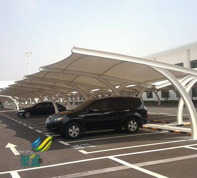 聚翼膜結構車棚質量輕,只有同等大小玻璃的1%;韌性好、抗拉強度高、不易被撕裂,延展性大于400%;聚翼膜結構車棚耐候性和耐化學腐蝕性強,熔融溫度高達200℃;可有效的利用自然光,膜結構車棚節約能源;良好的聲學性能。