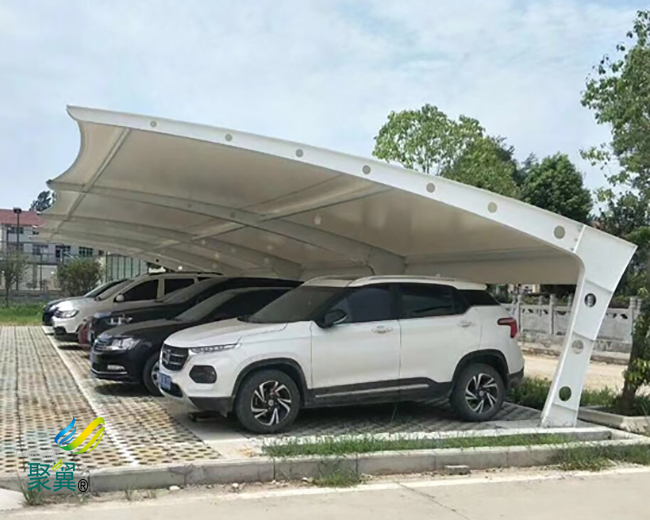 膜結構車棚具有藝術性,除了一般的雨篷具有不可比擬的使用價值,且比較耐用,膜結構車棚具有遮風擋雨的效果,不僅如此,還具有給人美觀的享受。膜結構車棚本身柔美曲線的效果,且可以剛柔并濟,造型豐富,使用的時候十分便利。