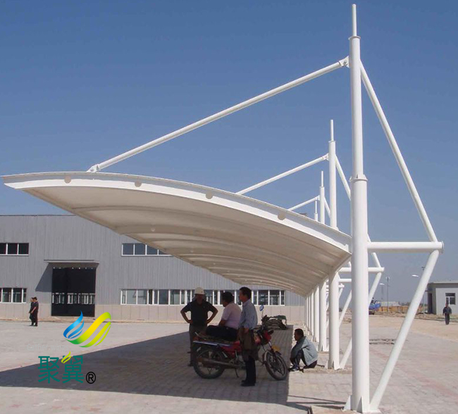 膜結構車棚自身的分量十分的輕盈,可隨意變形且接受大的沖擊力,而類似金屬等車棚就不能隨意的變形伸展,正因如此膜構造的車棚使用的壽命會更長, 因此被稱為“不破玻璃”。