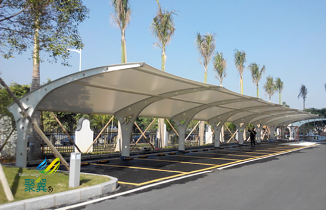 膜結構車棚所用膜材料由基布和涂層兩部分組成.基布主要采用聚酯纖維和玻璃纖維材料;涂層材料主要聚氯乙烯和聚四氟乙烯。膜結構車棚常用膜材為聚酯纖維覆聚氯乙烯(PVC)和玻璃纖維覆聚聚四氟乙烯(Teflon)。