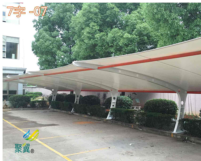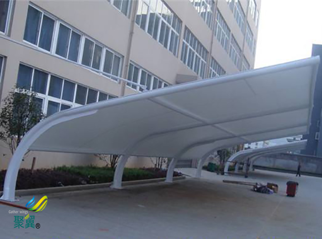 膜結構車棚的加工制作過程,膜結構停車棚所用膜材料由基布和涂層兩部分組成。膜結構車棚具有強度低、彈性大、易老化、徐變大、自潔性差,但價格便宜,容易加工制作,色彩豐富,抗折疊性能好等等特點。
