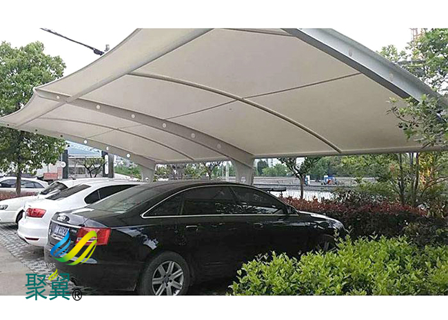 經(jīng)濟性,由于膜結(jié)構(gòu)車棚膜材具有一定的透光率,白天可減少照明強度和時間,能很好地節(jié)約能源。同時夜間彩燈透射形成的絢爛景觀也能達到很好的廣告宣傳效益。膜結(jié)構(gòu)車棚膜建筑屋面重量僅為常規(guī)鋼屋面的1/30,這就降低了墻體和基礎(chǔ)的造價。
