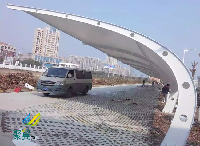 膜結構車棚工期較短,在景觀膜的施工中,所有的加工制造都可以根據設計在工廠完成,只有工廠在現場停止運行,與膜結構車棚傳統建筑的施工周期相比,幾乎快了兩倍。