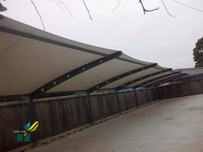 膜結構車棚懸掛臂安裝焊接:膜結構車棚懸掛臂安裝采用焊接,需檢查焊接節點,調節懸掛臂設計坡度,準確無誤方能進行焊接。靠邊一條懸掛臂準確無誤后,安裝另一邊一條膜結構車棚懸掛臂,就位準確后點焊。