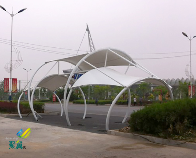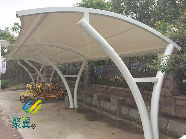 藝術性。膜結構是一種新型的建筑結構形式,膜結構車棚不同于中國傳統建筑。由于膜結構車棚占地面積小、可便于安裝拆卸等特點,設計師可以充分發揮自己的想象力,膜結構車棚設計出造型多樣、不拘一格的停車棚。