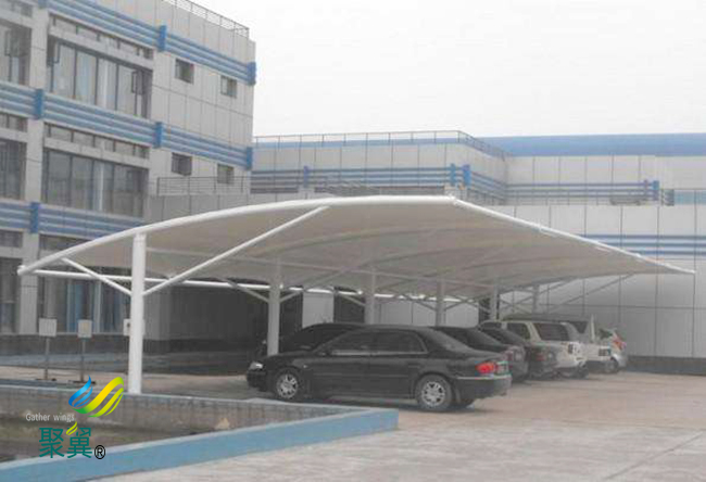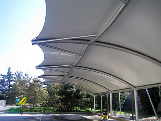 膜結構車棚頂部選用的是德國的聚碳脂板材,骨架選用的是6063-T5新式鋁合金,資料通過國家GB624-97測驗,達阻燃B1級。色彩性,膜結構車棚在棚內人們對白色或米白色膜材會有很好的色彩感知,因為這兩種色彩表現出對可見光具備線性光譜透射的特征。透射程度隨透射光波長的增添而增添,這使得透射光比入射光略暖和。透射光譜與纖維及其特性、涂層的厚度等。