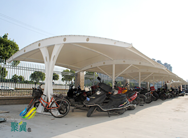 膜結構車棚通過(鋼架、鋼柱或鋼索)一定方式使其內部產生一定的預張應力以形成某種空間形狀,作為覆蓋結構,并能承受一定的外荷載作用的一種空間結構形式,膜只能承受拉力而不能受壓和彎曲,膜結構車棚曲面穩定性是依靠互反向的曲率來保障,因此需制作成凹凸的空間曲面,故習慣上又稱空間膜結構。