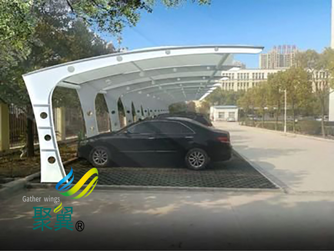 膜結(jié)構(gòu)車棚景觀造型不同,可呈現(xiàn)多變、新穎、吸引人的視覺結(jié)果。膜結(jié)構(gòu)車棚的應(yīng)用范圍限于體育或展覽建筑,還擴(kuò)展到住宅和景觀建筑。