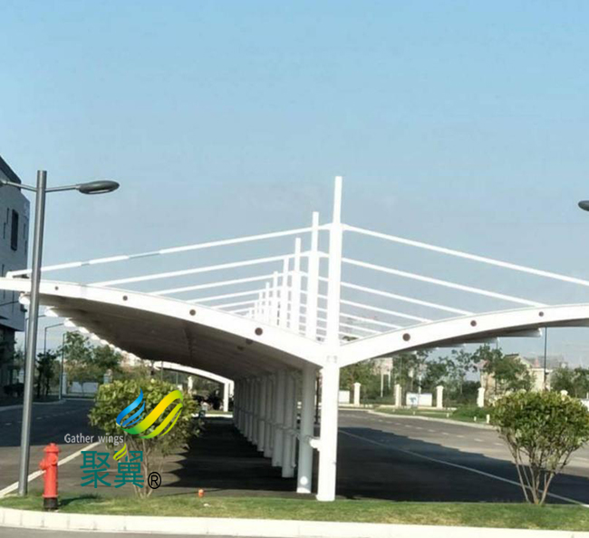 膜結(jié)構(gòu)車棚是由上面造型獨(dú)特的膜材質(zhì)和下面骨架的鋼結(jié)構(gòu)、鋼索組成的,現(xiàn)場(chǎng)裝置即可完結(jié)。