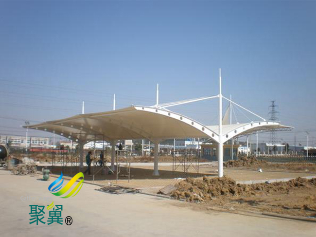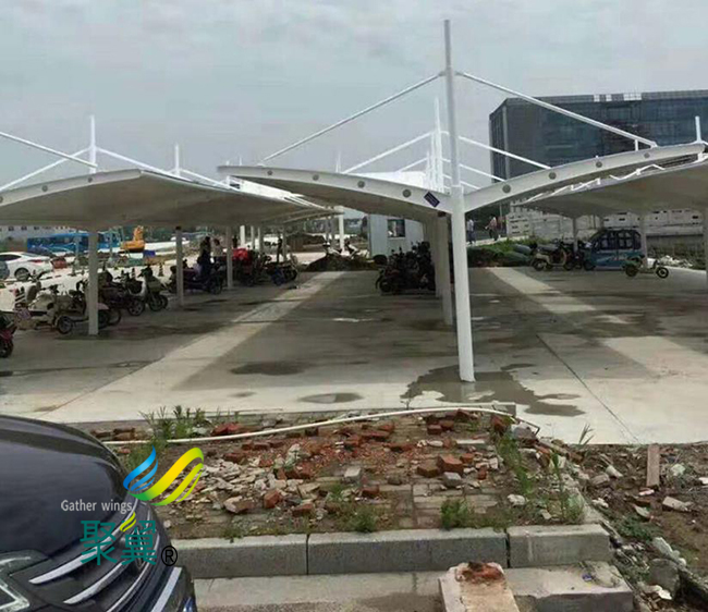 膜結構車棚是由上面造型獨特的膜材質和下面骨架的鋼結構、膜結構車棚鋼索組成的,現場裝置即可完結。
