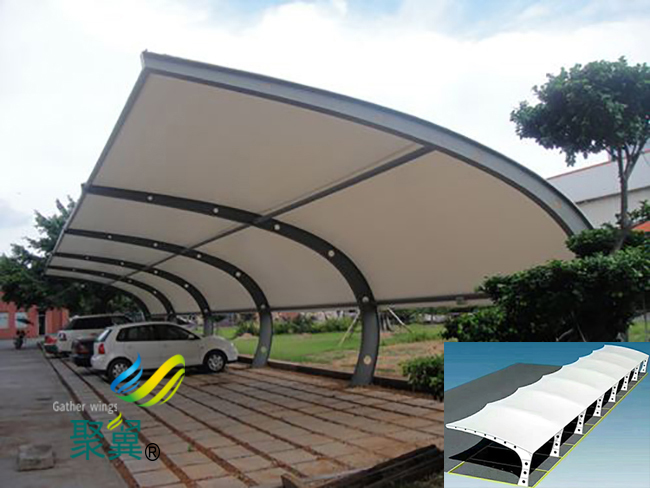 膜結(jié)構(gòu)車棚膜材料是指以聚酯纖維基布或PVDF、PVF、PTFE等不同的表面涂層,配以優(yōu)質(zhì)的膜結(jié)構(gòu)車棚PVC組成的具有穩(wěn)定的形狀,并可承受一定載荷的建筑紡織品。